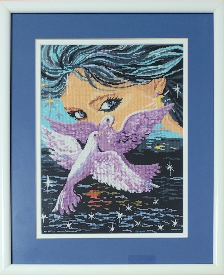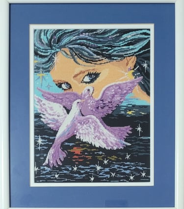 Acest goblen este o incursiune vizuală în mister și onirism. Contrastul dintre tonurile calde ale chipului și fundalul întunecat creează o atmosferă de reverie. Compoziția este dominată de privirea intensă și de siluetele celor doi porumbei, care sugerează libertate, iubire și forță spirituală. O lucrare care emană energie mistică, feminină și o putere de atracție hipnotică.