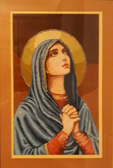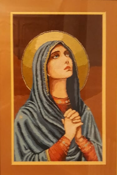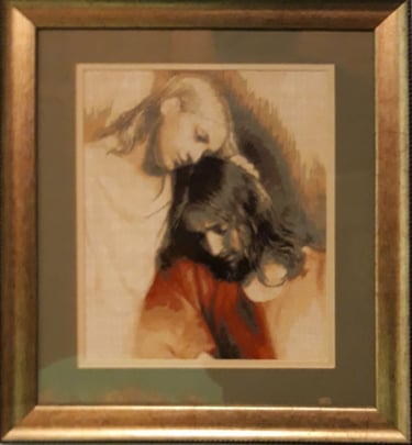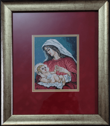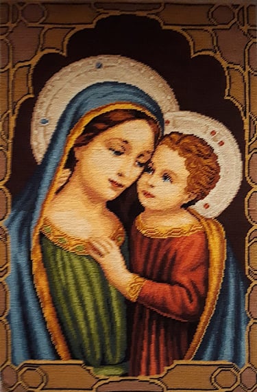 Această operă surprinde tandrețea sacră a iubirii materne. Goblenul redă cu sensibilitate îmbrățișarea protectoare și privirea plină de blândețe dintre Fecioara Maria și Prunc. Jocul subtil de umbre și lumini oferă profunzime și viață chipurilor, insuflând liniște, credință și căldură sufletească.