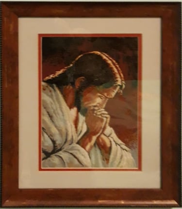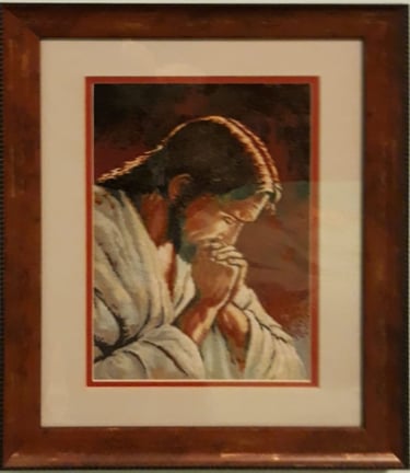 Goblenul surprinde intensitatea sacră a momentului de rugăciune intimă. Contrastul dintre lumină și umbră sculptează figura lui Iisus, punând în evidență gestul de adâncă implorare al mâinilor împreunate. Paleta de tonuri calde imprimă chipului vulnerabilitate și devoțiune. O lucrare menită să inspire reculegere și contemplare.