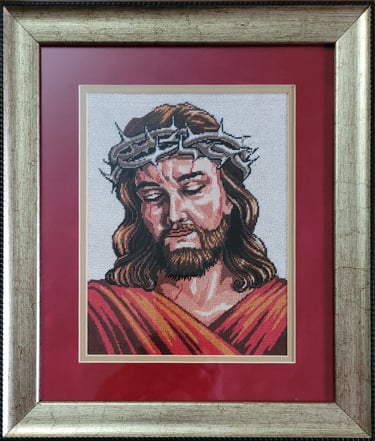 Acest goblen imortalizează momentul suprem al Patimilor cu imaginea sacrificiului Mântuitorului. Compoziția obține un impact dramatic intens prin contrastul dintre tonurile roșii evocând suferința și abnegația unui Iisus mortificat de o coroană de spini cu aspect aproape metalic. O piesă de o forță emoțională copleșitoare, destinată meditației asupra jertfei și iubirii divine.